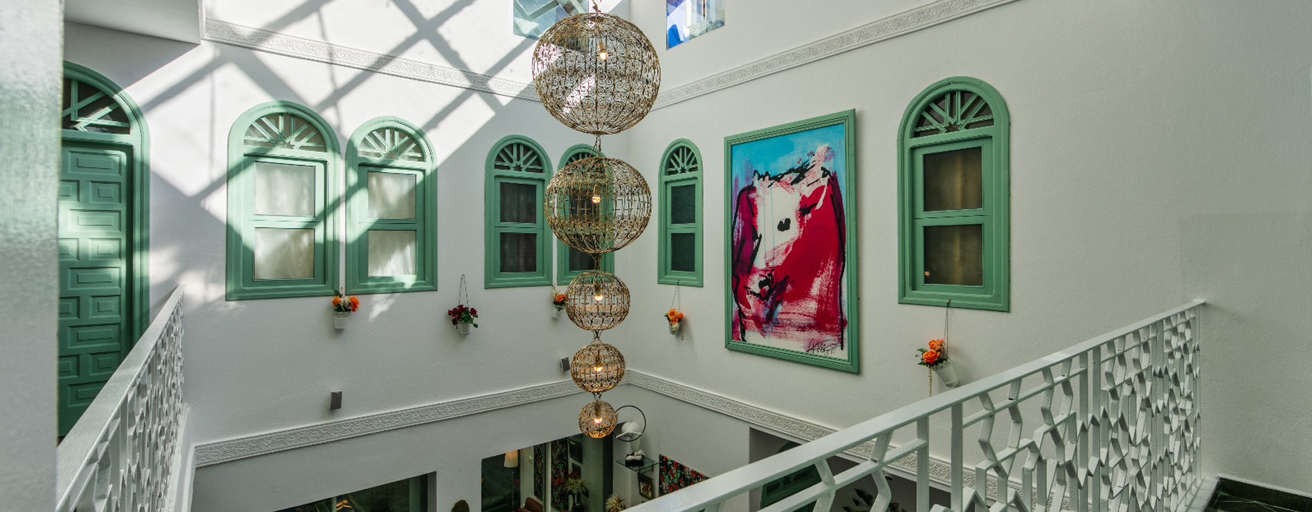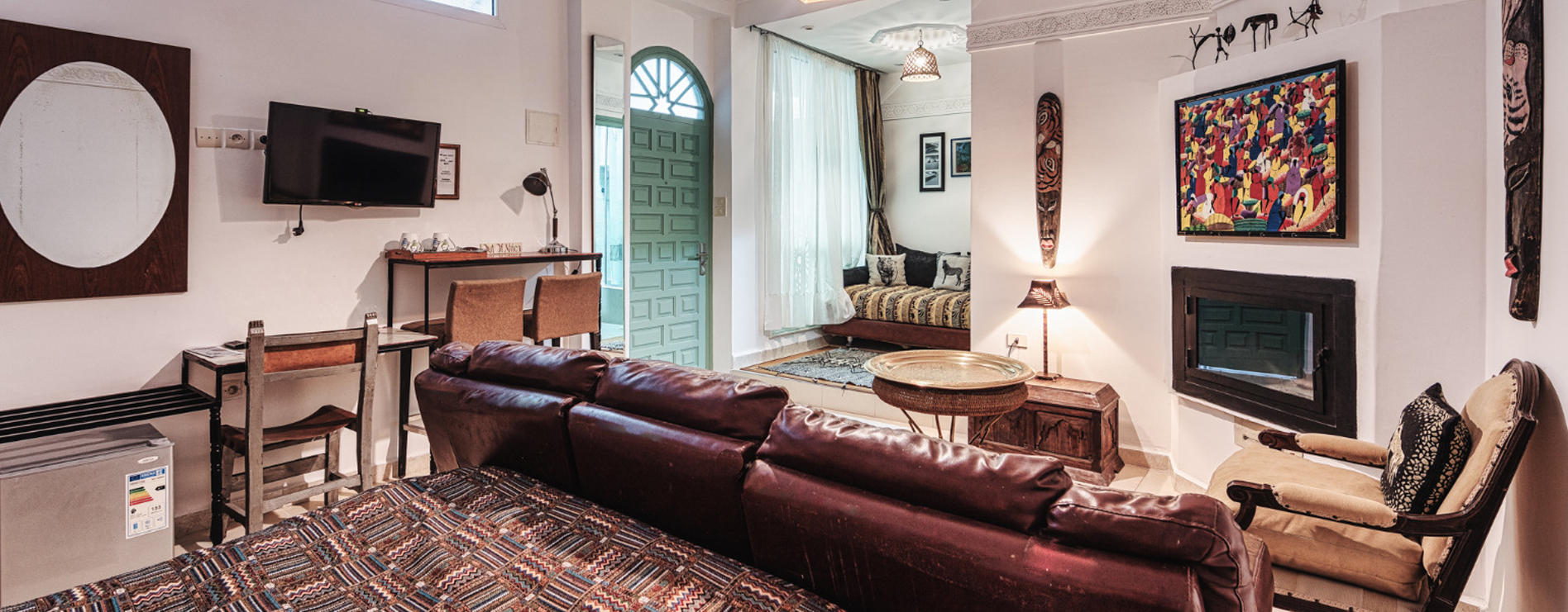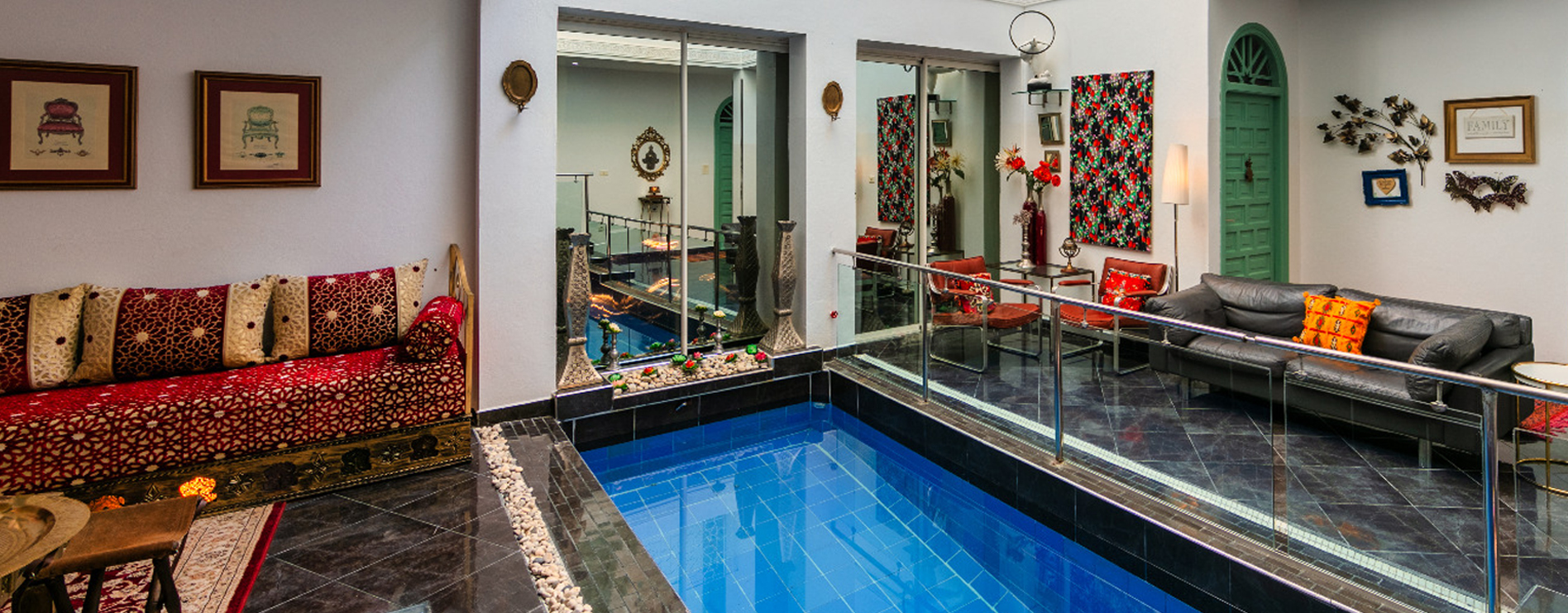 Les salles et les chambres sont décorées avec un goût exquis, mêlant les éléments traditionnels marocains aux touches modernes et artistiques. Les couleurs sont vives et audacieuses, les motifs sont complexes et délicats. Chaque détail a été soigneusement pensé pour créer une ambiance unique et décontractée.